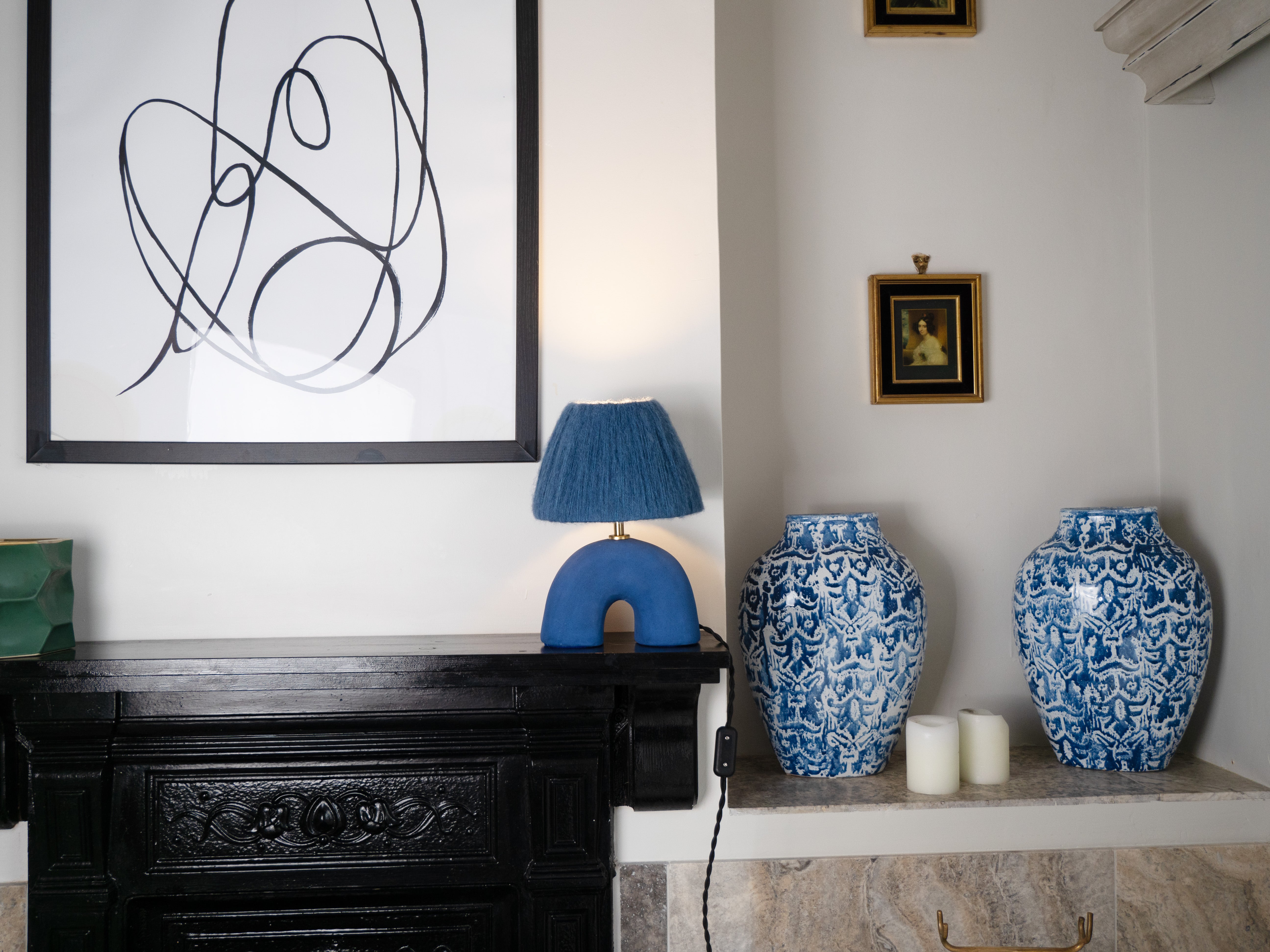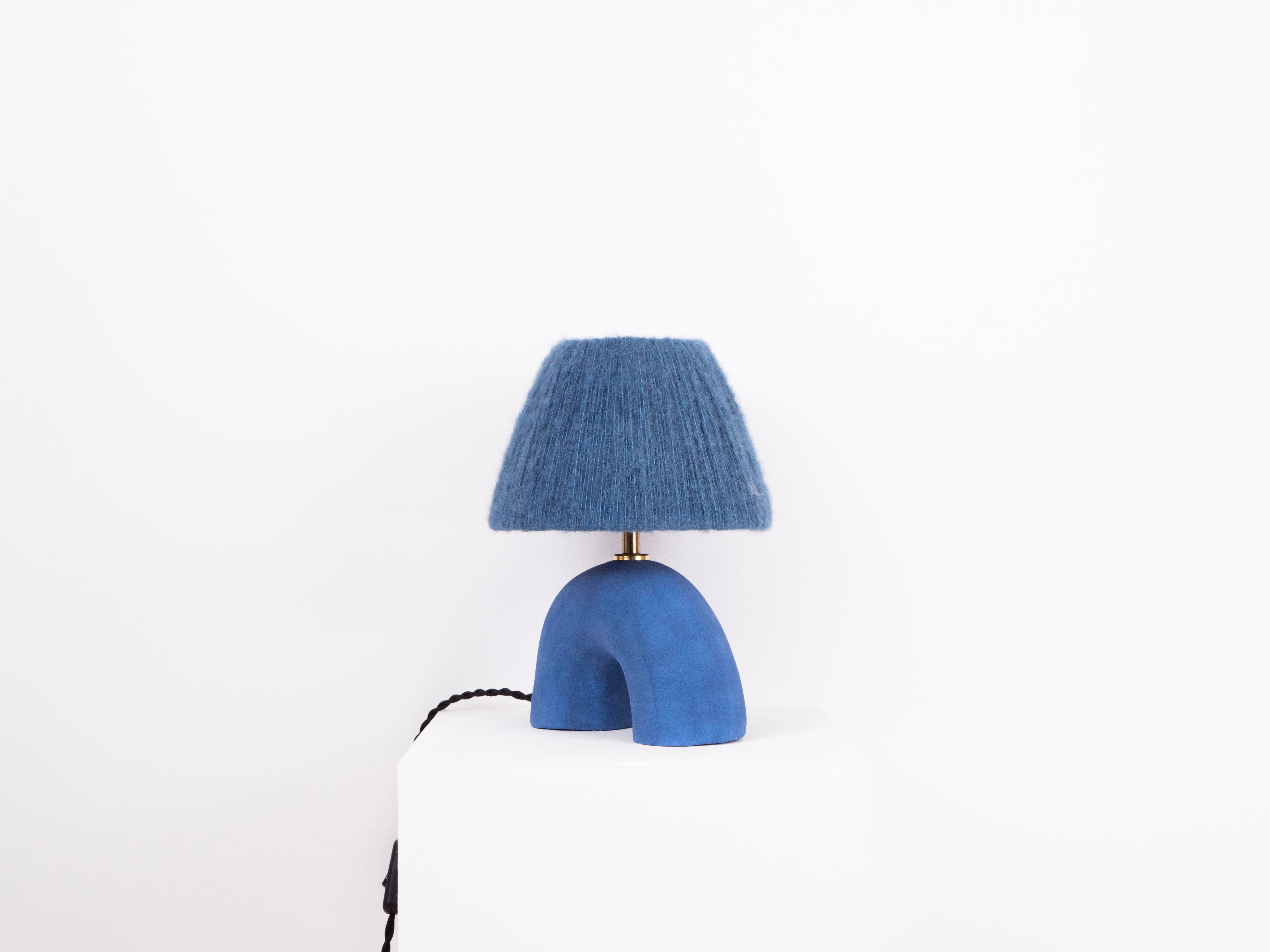 Blue lamp base with a matte finish paired with a matching Steel Blue wool lampshade