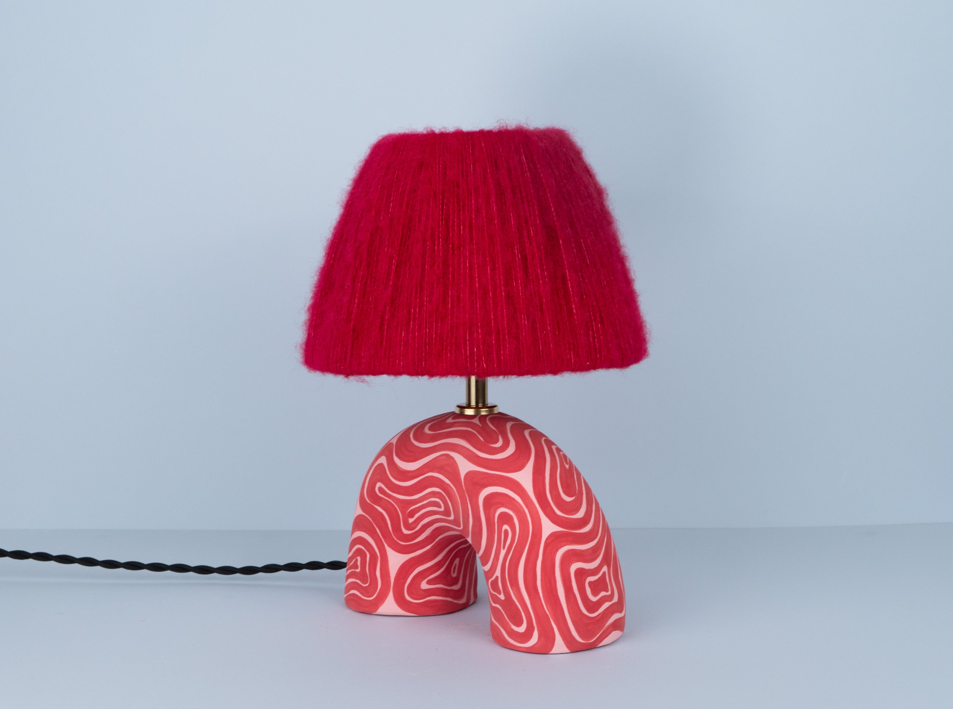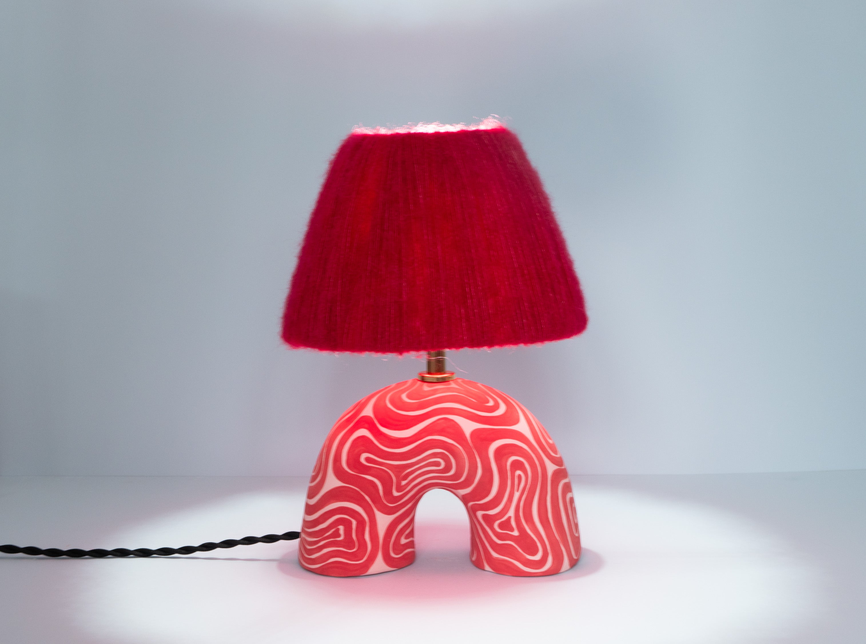 Red and Pink lamp base with a swirl pattern and matte finish paired with a matching Red wool lampshade