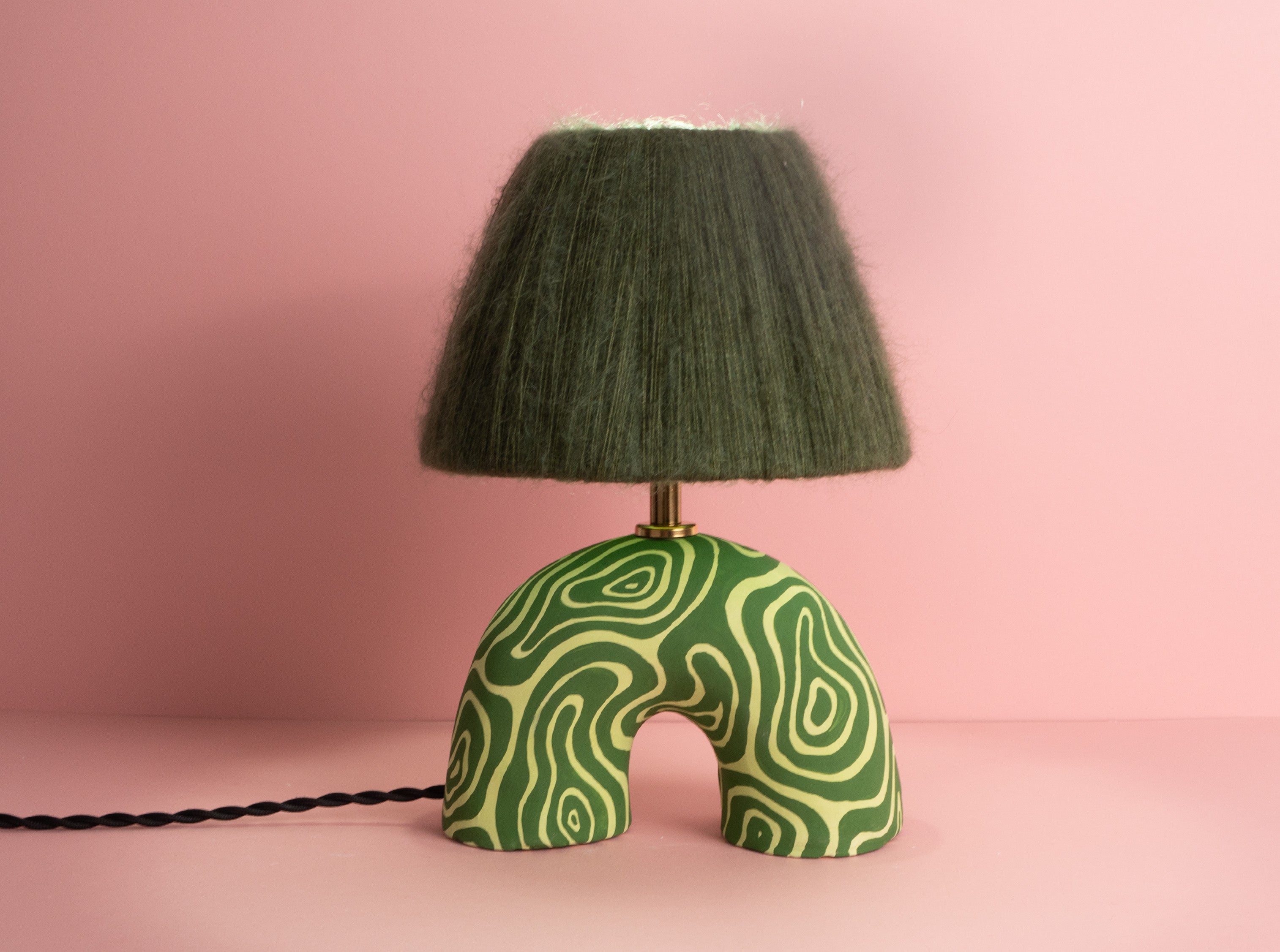 Two-tone Green lamp base with a matte finish paired with a matching Forest Green wool lampshade