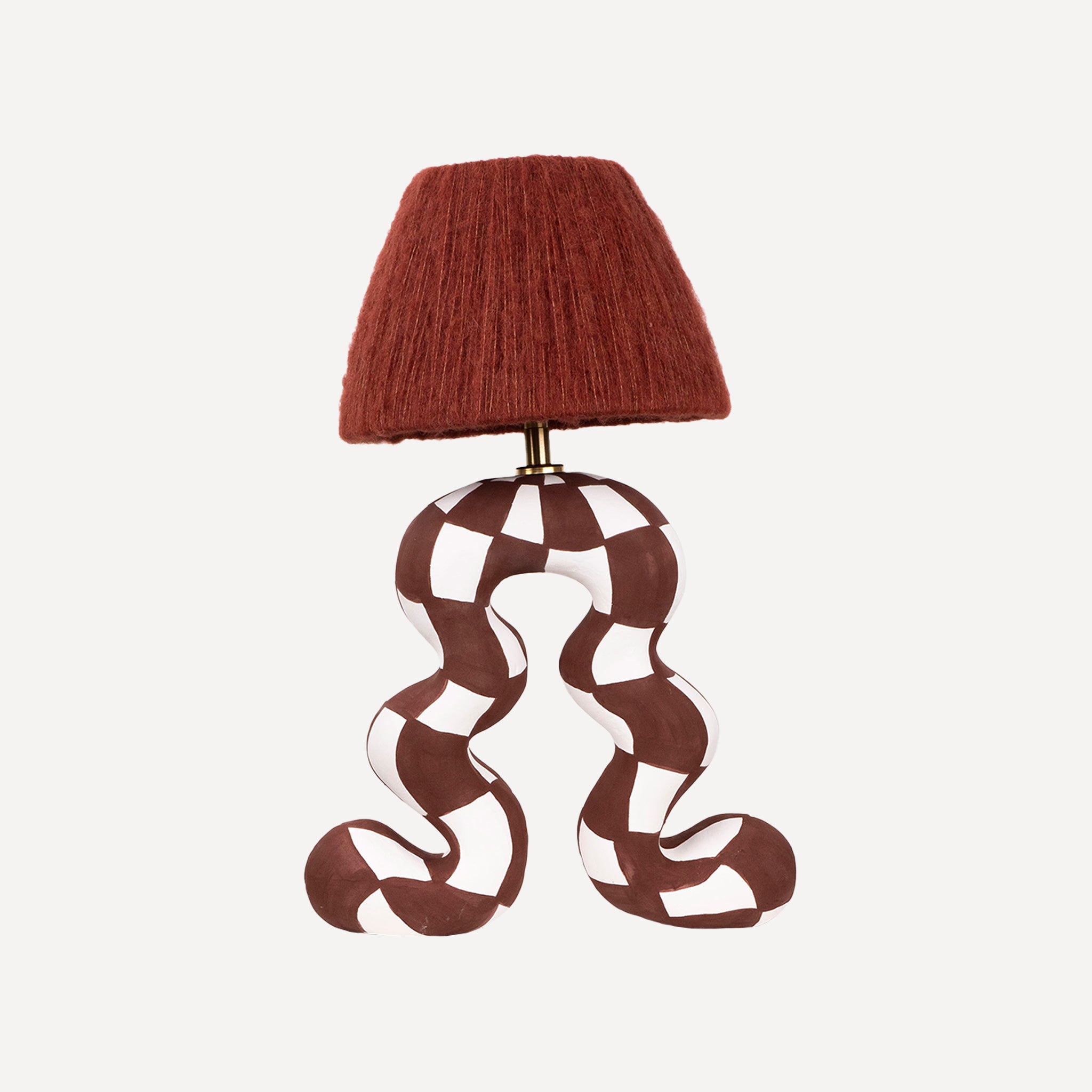 Brown and White lamp base with a checkerboard pattern and matte finish paired with a matching Dark Rust wool lampshade